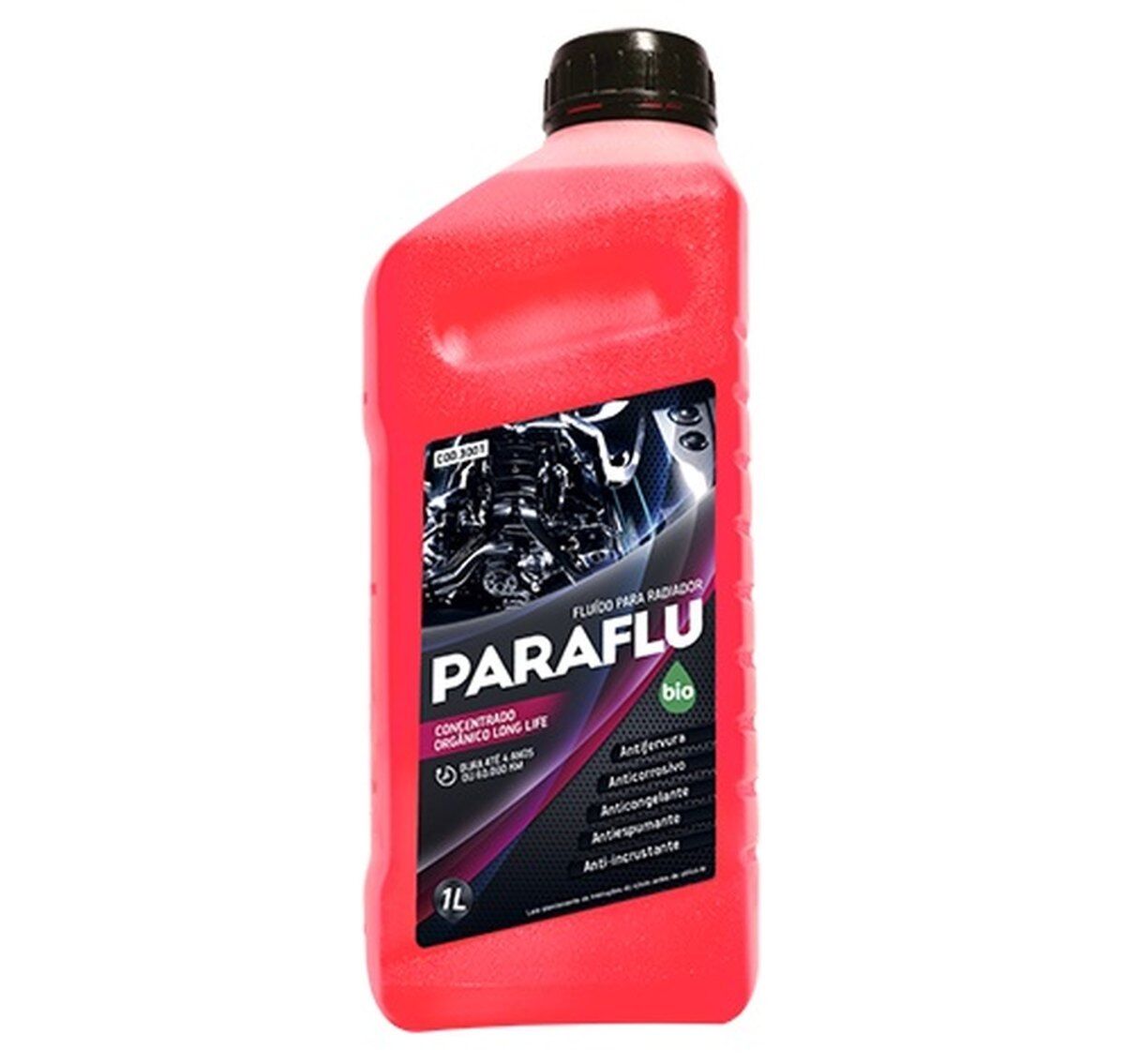 O fluido Paraflu Bio Orgânico Concentrado possui uma formulação balanceada a base de glicóis e inibidores de corrosão orgânicos que foram desenvolvidos com a mais alta tecnologia para oferecer máxima proteção para o sistema de arrefecimento de motores endotérmicos de automóveis, utilitários, caminhões, máquinas agrícolas e motores estacionários. Paraflu Bio Orgânico possui a tecnologia Long Life OAT (Organic Acid Tecnology), que aumenta a vida útil do motor lubrificando a bomba d’água, a válvula termostática, evitando o ressecamento das mangueiras e protegendo contra a corrosão todos os tipos de motores. Sua formulação eleva o ponto de ebulição e reduz o ponto de congelamento, protegendo também contra o superaquecimento e o congelamento além de proteger contra a cavitação e não atacar os sensores eletrônicos. Possui propriedade antiespumante e anti-incrustante.